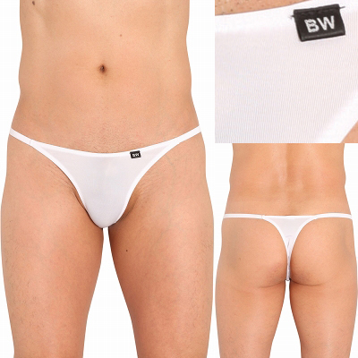 光るホワイトカラーが清潔感を与える、メンズ用Tバックショーツ。