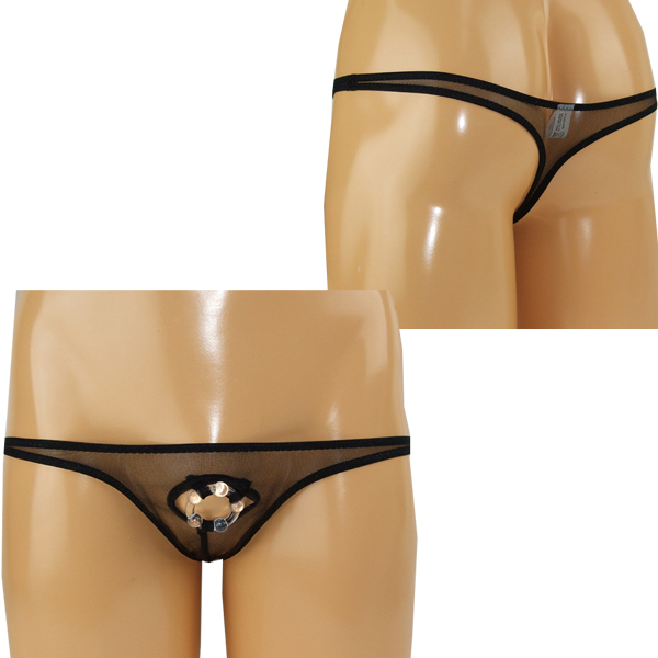 逞しいボディをアピールするならセクシーな小悪魔Tバックで決まり!極薄生地のフロント部分を丸く切り抜き、締め付け刺激するイボ付きリングを取り付けたメンズ用の日本製オープンランジェリー。