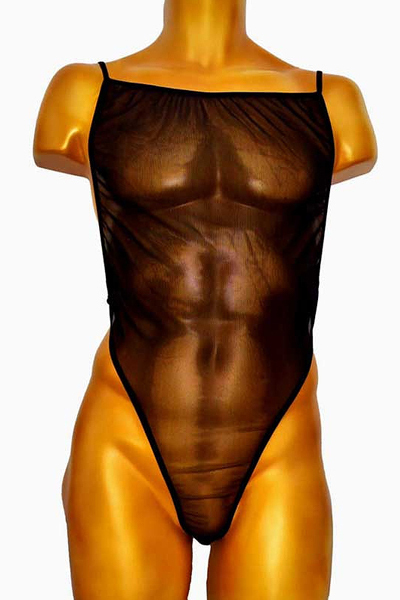 筋肉美を際立たせるシアー素材を使用した黒の男性用ボディストッキング。
