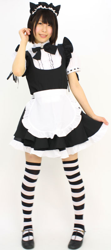 ピンと立ったネコ耳カチューシャ、鈴付きのリボン、ブラウスの袖口にはハシゴレース+リボンのこだわりも!ミニ丈のメイド服が欲しい方には絶対お勧め!これであなたも可愛いネコメイドさんに変身です。