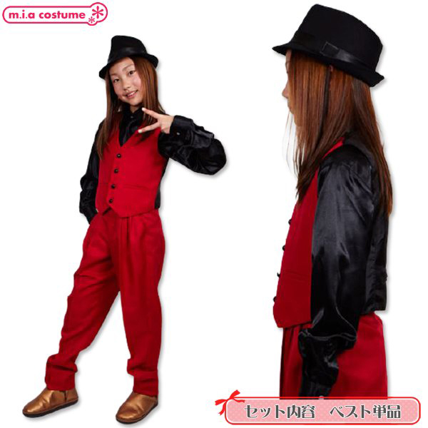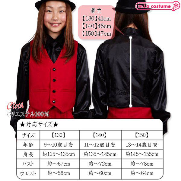■仕様:140サイズ 対応サイズ:身長135〜145cm・B〜72cm・W〜60cm 実寸:着丈45cm セット内容:ベスト単品(前ボタン) 素材:ポリエステル100%