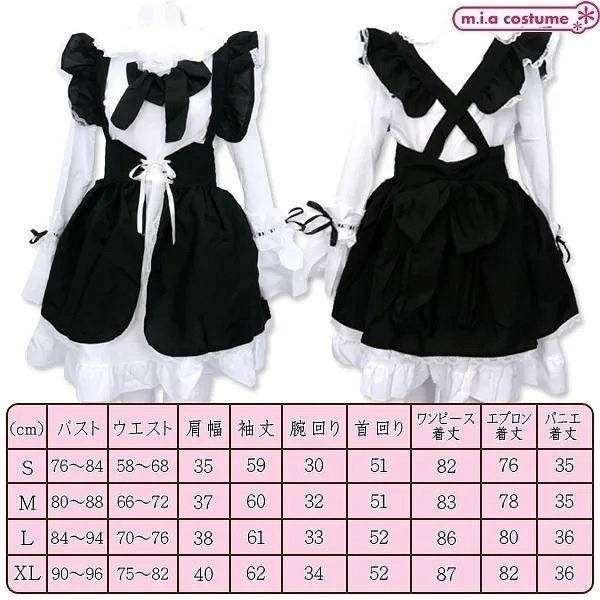 ■仕様:Mサイズ:B80〜88cm・W66〜72cm・肩幅37cm・袖丈60cm・腕周り32cm・首周り51cm・着丈(ワンピース83cm、エプロン78cm、パニエ約35cm)・帽子頭周り55cm セット内容:胸リボン付きワンピース、編み上げリボン付きエプロン、パニエ、コサージュ、カチューシャ、帽子