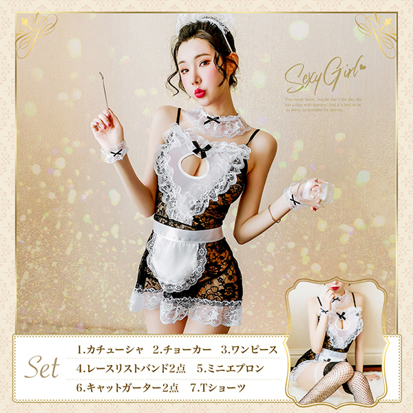 ■仕様:フリーサイズ セット内容:カチューシャ、チョーカー、ワンピース、レースリストバンド×2、ミニエプロン、キャットガーター、Tバックショーツ